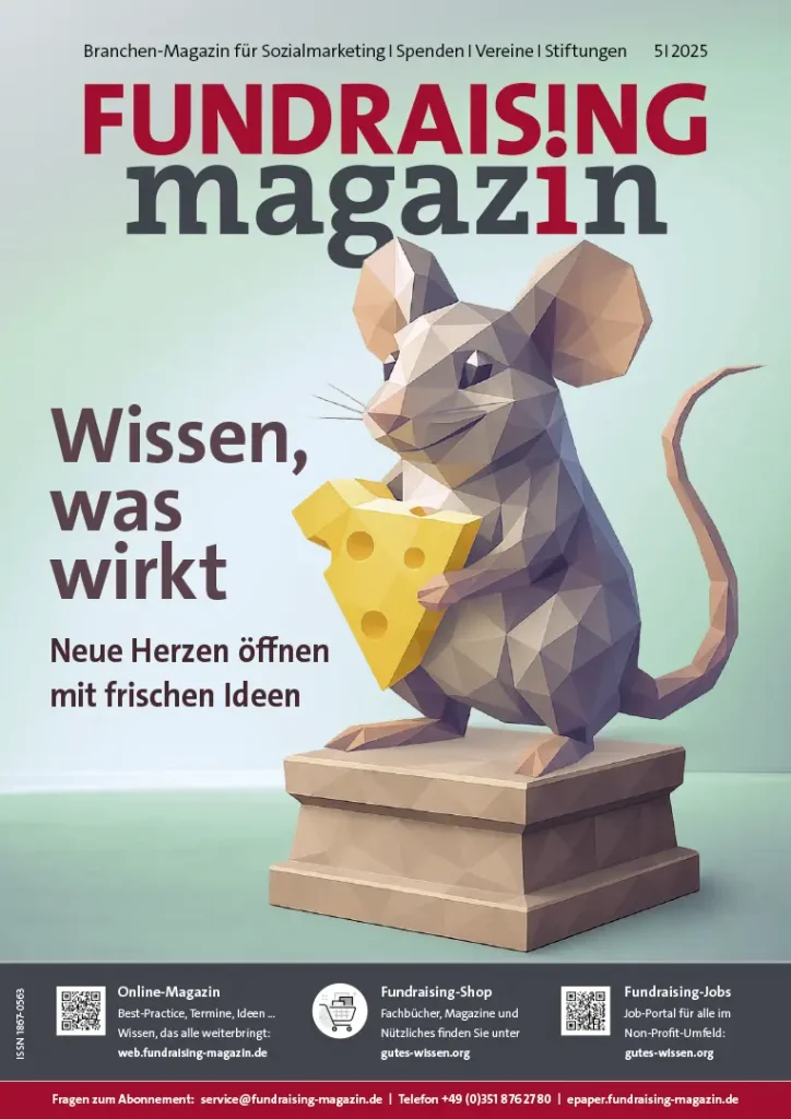 Neuspender-Gewinnung ist der Themenschwerpunkt dieser Ausgabe. Welche erprobten Methoden funktionieren? Welche neuen Techniken und Tools liefern? Welche Themen sprechen neue Zielgruppen an? Spannend ist auch unser Bericht „Wie Ungarns NGOs unter Druck stehen – und warum sie trotzdem nicht aufgeben“. Der Blick nach Budapest zeigt, wie fragil zivilgesellschaftliche Arbeit in Europa heute schon ist und was Organisationen in D-A-CH daraus lernen können. Und gibt es wieder interessante Interviews: Nora Circosta vom Vorstand der Petitionsplattform innn.it verrät, warum ihre Organisation auf die Gemeinnützigkeit verzichtet. Markus Beckedahl, Gründer des Blogs netzpolitik.org und Mit-Initiator der Konferenz re:publica, erklärt warum Bequemlichkeit im digitalen Alltag gefährlich ist. Die Fundraiserin Britta Kollberg ist seit 100 Tagen im Job und erzählt von Erfahrungen bei der humanitären Hilfsorganisation Medair. Malte Schumacher hat unseren beliebten Fragebogen ausgefüllt und verrät Persönliches. Die Rubrik „Arbeitswelt“ gibt Tipps für den Fundraising-Alltag: Wie Freiwillige gesund engagiert bleiben. In der Rubrik „Schöner Scheitern“ können selbst Alpakas die Kampagne nicht retten. Die „Persönlichen Gedanken“ von Philipp Reiber drehen sich um den Aspekt Warum „Beziehung first!“ mehr zählt als „KI first! Darüber hinaus zeigen wir wieder gute Best-Practice-Beispiele aus Projekten und Stiftungen. Zu guter Letzt gibt Fabian F. Fröhlich in seiner Glosse Tipps für eine effiziente Jahresplanung.mehr anzeigen